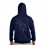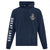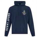 Navy hoodie with bold anchor on the front and Great Lakes map on the back. Cozy, stylish, and inspired by South Shore lakeside living and adventure.