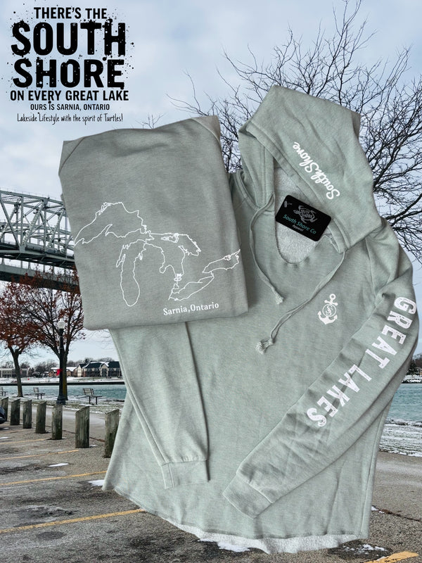 Celebrate the South Shore Great Lakes lifestyle with this stylish cropped hoodie. Featuring a V-neck with drawstrings, cuffed sleeves, and a unique anchor design on the front, it’s a perfect blend of comfort and lakeside charm. There's a 'South Shore' on every Great Lake, ours is Sarnia Ontario, the beautiful Lake Huron.