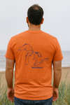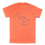 Orange heather tee with sunshine and wave design on front with Great Lakes on the back. Soft, vibrant, and rooted in South Shore lakeside spirit.